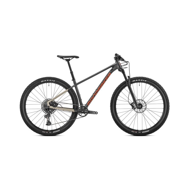 La Mondraker CHRONO R es una bicicleta de montaña de cross country construida con un cuadro de aluminio 6061 Xtralite Alloy. Tiene una geometría XC FORWARD que la hace eficiente en las subidas y ágil en las bajadas. Está equipada con una horquilla Fox Float Rhythm de 100 mm de recorrido con bloqueo desde el manillar, una transmisión SRAM GX Eagle/SX Eagle de 12 velocidades, frenos SRAM Level y componentes ONOFF.
